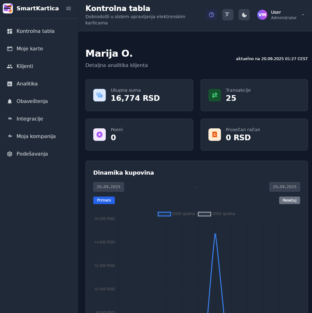 SmartKartica.rs предоставляет бизнесу мощный инструмент аналитики, который помогает принимать решения на основе данных, а не догадок. Страница аналитики — это центр управления вашей программой лояльности, где вы видите, как клиенты используют карты, сколько у вас активных пользователей и какие кампании приносят наибольший результат. Вместо сложных таблиц вы получаете наглядные графики и отчеты, которые легко понять даже без опыта работы с аналитическими системами.
