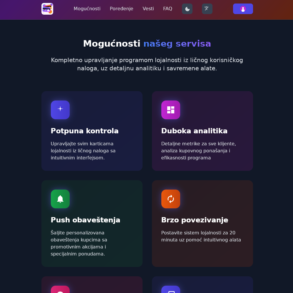 С помощью страницы онбординга вы легко запускаете кампании без сложных IT-настроек: добавляете поля, настраиваете логику и сразу получаете клиентов, вовлечённых в вашу программу. Это снижает затраты на маркетинг, увеличивает конверсию и помогает строить долгосрочные отношения с вашей аудиторией. В итоге SmartKartica.rs превращает первый шаг клиента в яркий и запоминающийся опыт.